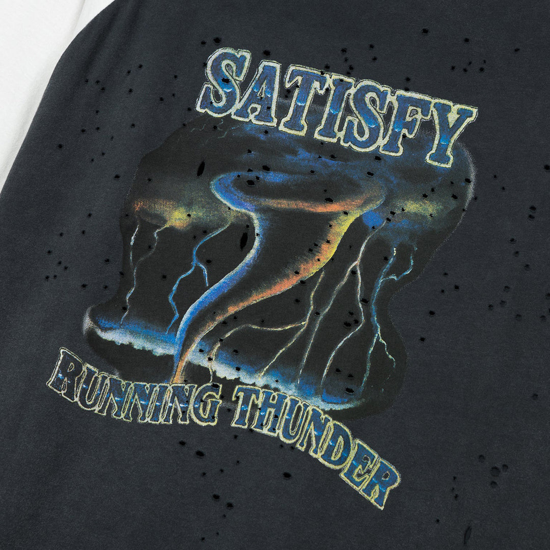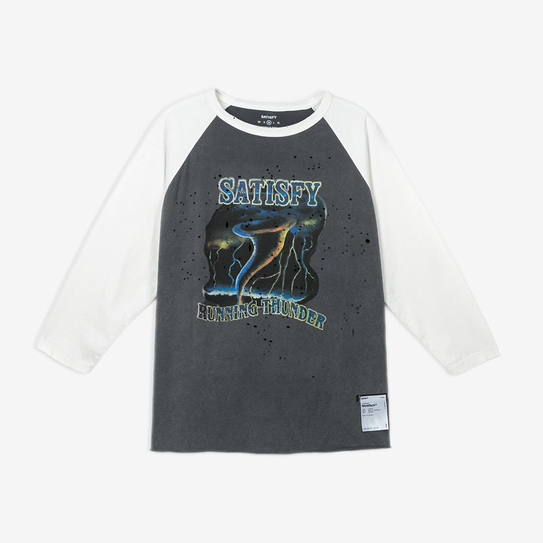 Cut from the lineage of baseball silhouettes. Recast for the run. Raglan sleeve construction frees the shoulder line. A shape borrowed from heritage sport and re-tuned for endurance. SATISFY Running Thunder electrifying the frontside for stepping into tornado valley and finished with SATISFY Running equipment starring on the backside. Stealth-reflective ©SATISFY logo, for catching light in the dark. Fully detachable care label on the outside. Nothing inside that shouldn’t be.
