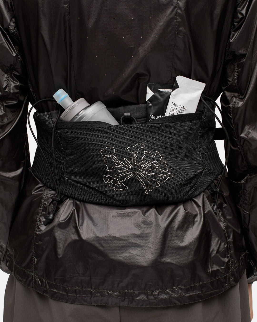 Three stretch pockets and one zipped compartment organise nutrition and valuables, while UHMWPE grid mesh on the front and side pockets increases durability in high-stress zones. The belt comfortably carries a 500ml soft flask, phone, food, keys and a lightweight jacket. Two adjustable external cords allow you to strap poles or additional layers securely when terrain or weather shifts.