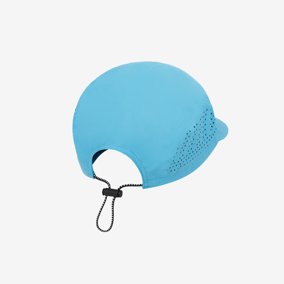 Made from a lightweight, quick-drying polyester fabric, the revised five-panel design wraps around the head for maximum protection and a secure fit. Laser-cut holes at the side of the cap allow hot air to vent away from the head so you can concentrate on your pacing without overheating. A simple drawstring closure at the rear adjusts with a single pull for the perfect fit every time. A new elliptical peak has been designed for on-run performance - keeping out both the sun and the rain.